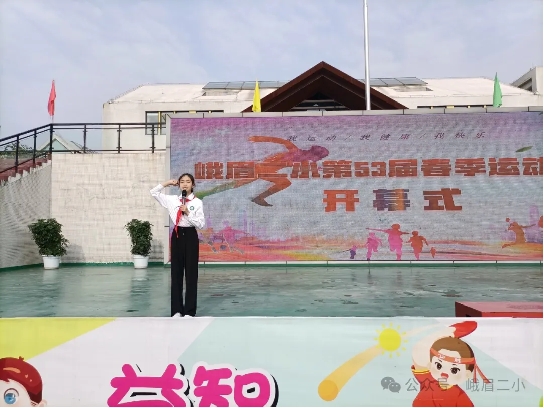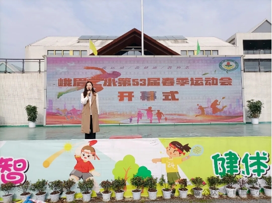 学校党总支书记李建玲宣布:峨眉二小第53届田径运动会开幕!这是速度和激情的盛典,这是力量与美丽的盛宴。