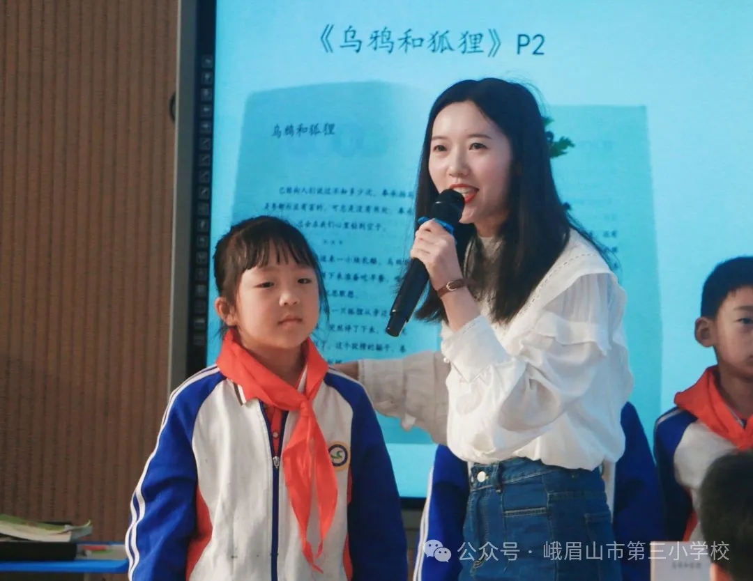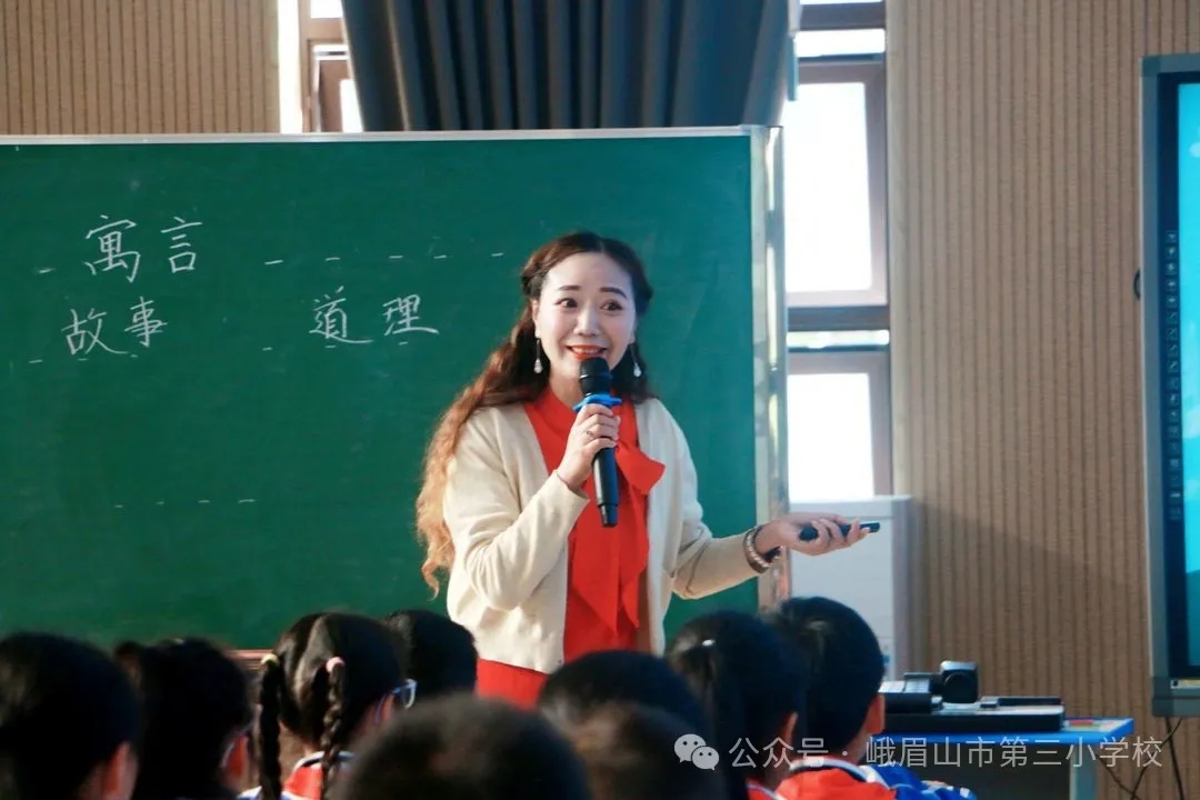 在分享课上,来自峨眉三小的邹馨瑶老师巧妙设计了“秀一秀”“辩一辩”等五个阅读活动让学生充分感受“不同的寓言,同样的精彩”。同学们在“秀一秀”的活动中展示了自己对寓言的理解和成果,激发了创造力和表达能力。通过与他人分享,还学着从不同的角度看待寓言,拓宽了自己的思维,增加了学习的趣味性和深度。 通过“填一填”的示例表格,帮助学生更好地理解老故事中的新道理,同时也让学生掌握了一种可以将不同书籍的文本进行“分类比较”的阅读方法。在小组口头创编寓言活动中,培养了学生的合作能力和想象力,与小伙伴们一起创作故事的过程充满了乐趣和创意。最后的“荐一荐”给学生推荐了《给孩子的动物寓言》,从一本书到一类书,为学生建立起寓言更广阔全面的认知与阅读期待。