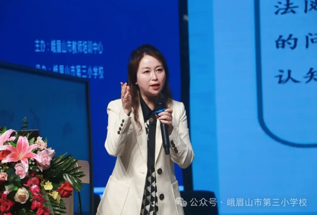 课例展示后,工作室主持人、峨眉三小校长杨丽以“学习任务群视域下的小学整本书阅读教学新样态”为题作专项培训。杨校长介绍了工作室的文化理念及行动追求,从整本书阅读的背景,整本书教学的设计,整本书任务群架构和整本书教学的建议四个方面全方面深入浅出地分析当下整本书阅读教学的目标价值。同时,结合今天呈现的三堂课例,从任务群视角细致剖析了整本书阅读教学不同课型的可视化活动架构,为与会教师打开了教学实践的方向与动力。