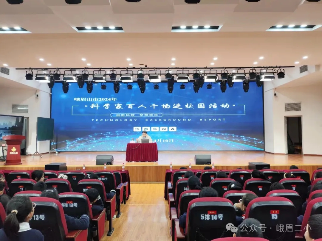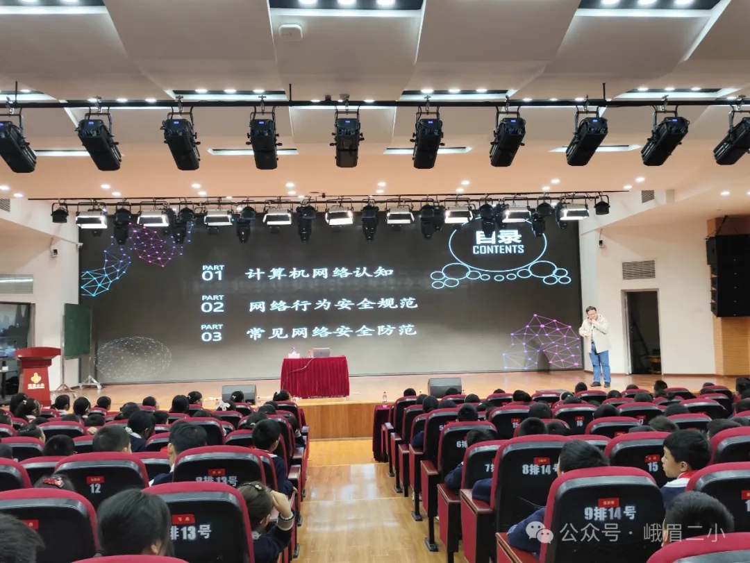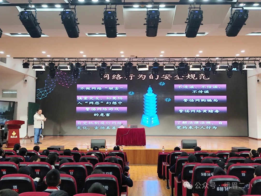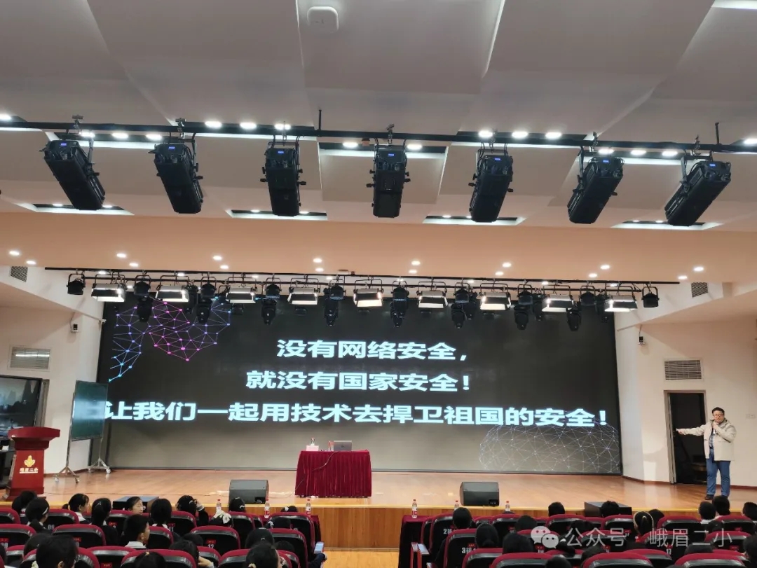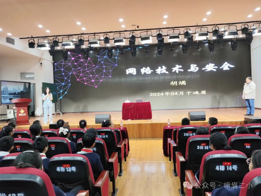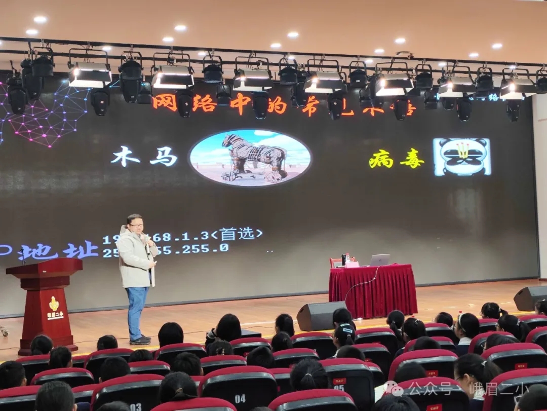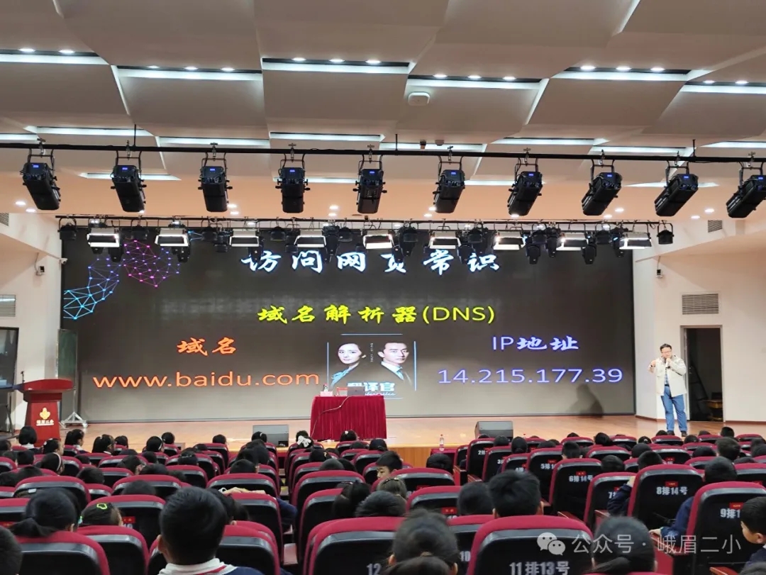 凝聚科学力量,走进万千校园。2024年4月10日上午,“科学家百人千场进校园”活动走进峨眉二小,四川财经职业学院教授、四川省关工委宣讲团成员胡燏为同学们带来的主题为“网络技术与安全”的专题讲座。
