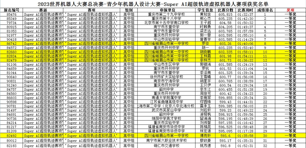 日前,峨眉一中从中国电子学会获悉,该校5位同学参加2023世界机器人总决赛青少年机器人设计大赛Super AI超级轨迹虚拟机器人赛项斩获高中组5个全国一等奖。