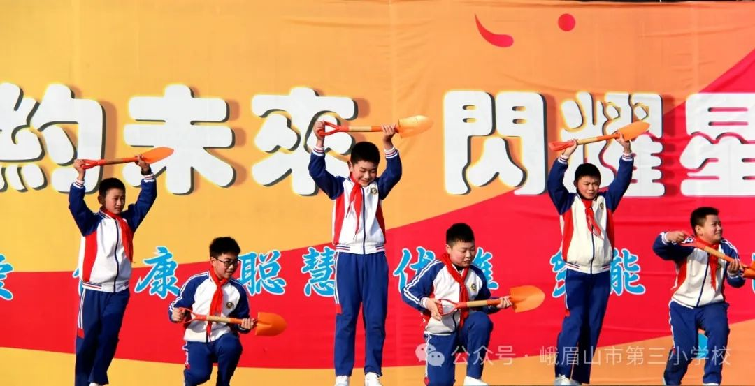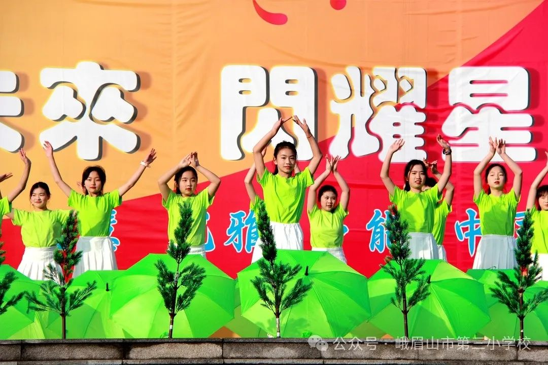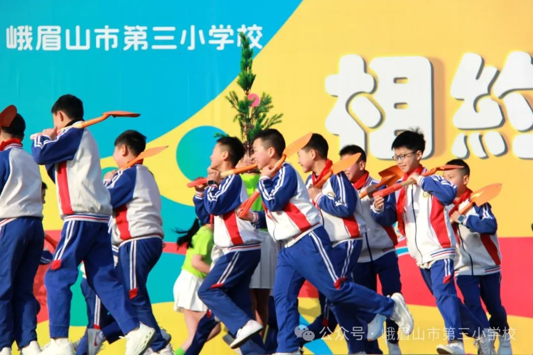 在欢快的音乐中,同学们尽情舞蹈。男同学挥舞着铁锹、锄头演绎出了一派繁忙的植树场景,女同学手捧小树、雨伞、水桶或水壶把树木的成长的每一个过程都展现得栩栩如生。当树木成林绿意盎然之时,空气中都弥漫着清新的气息,阳光明媚,微风拂面,远处传来鸟儿的歌唱声,这种情景让人感到心旷神怡。