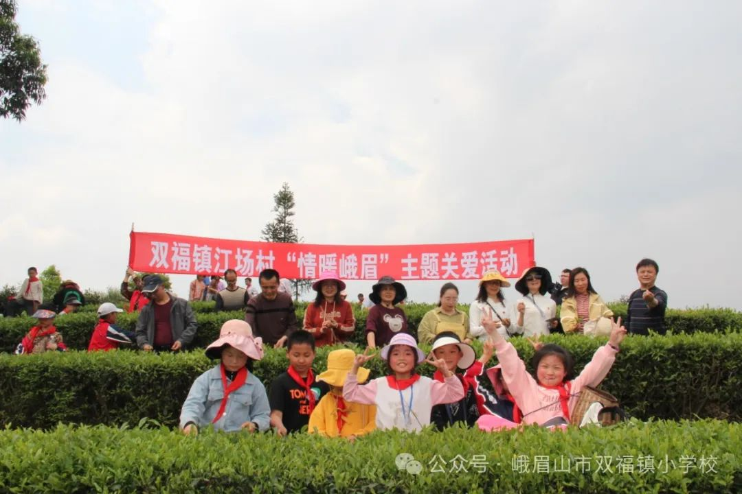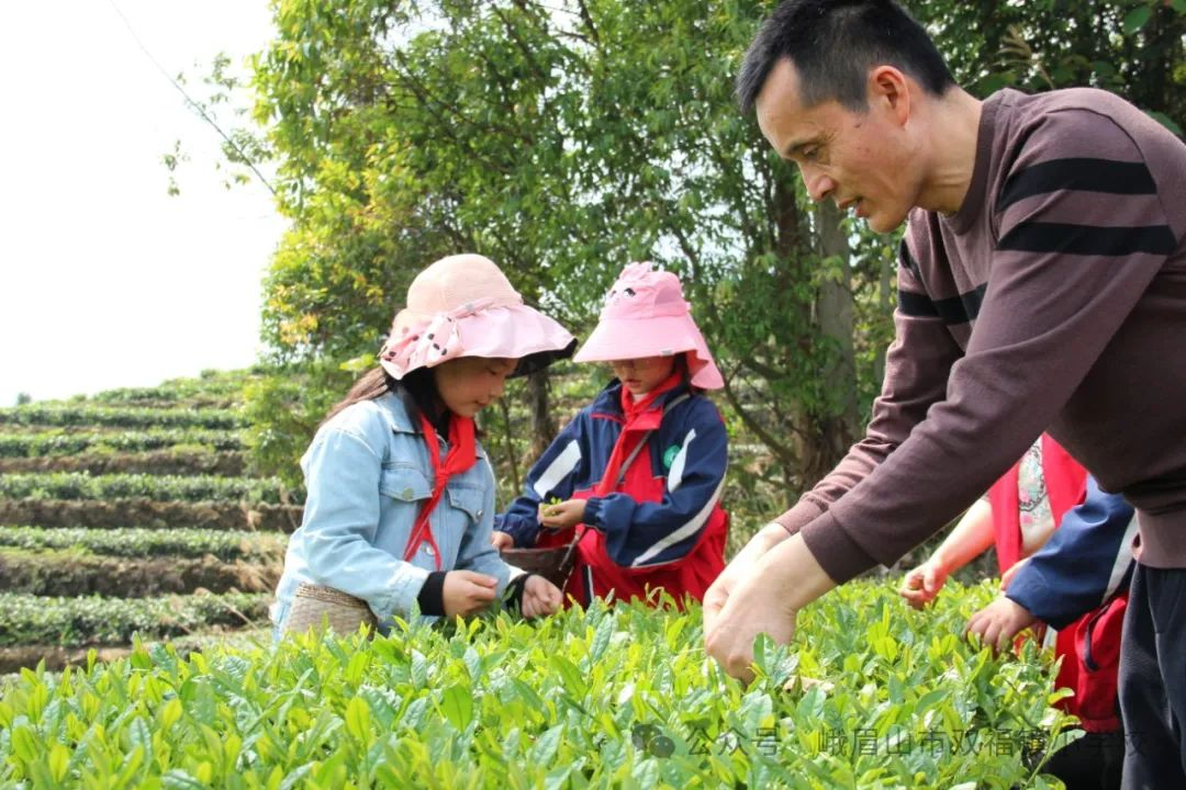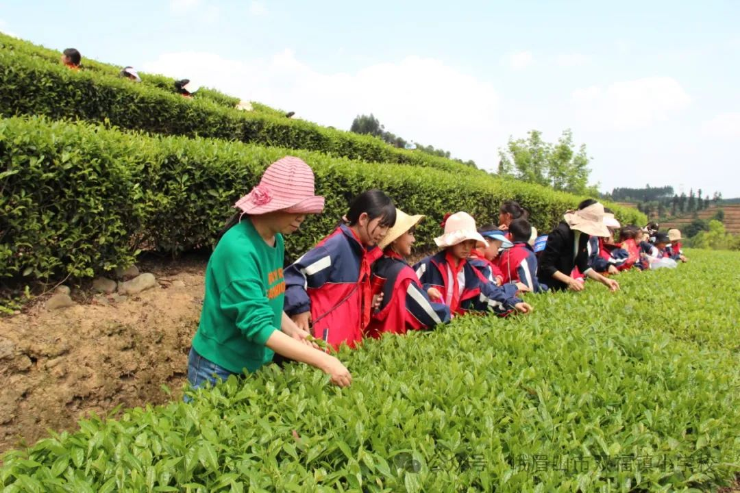 为丰富孩子们的校园生活,开拓视野,4月10日,峨眉山市双福镇小学组织三年级120余名师生开展茶文化研学活动。孩子们顿时化身“小茶农”,挎着小茶篓,戴着太阳帽,排着长长的队伍,走进茶园,感受来自家乡的“青绿”,与“茶香”撞了个满怀。