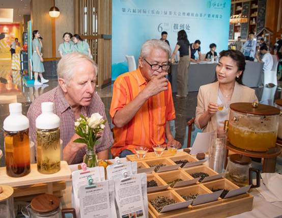 乐山绿茶大会上,龙骨山茶业公司总经理向国际友人介绍新式茶饮