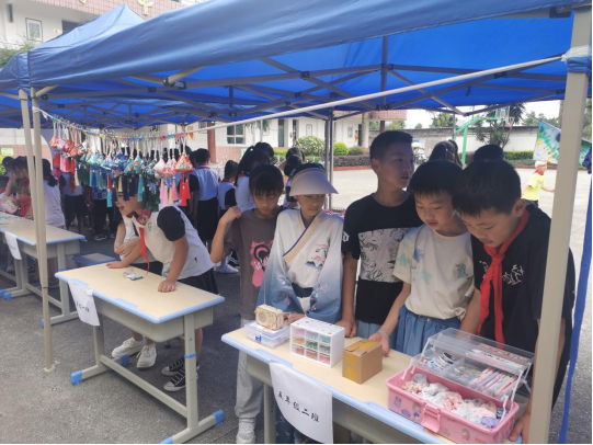 活动前,各班学生在交易会指定位置摆放售卖物品,他们把自己亲手制作的各类劳动成果,如手工艺品、美术作品、农作物产品等有序摆放。