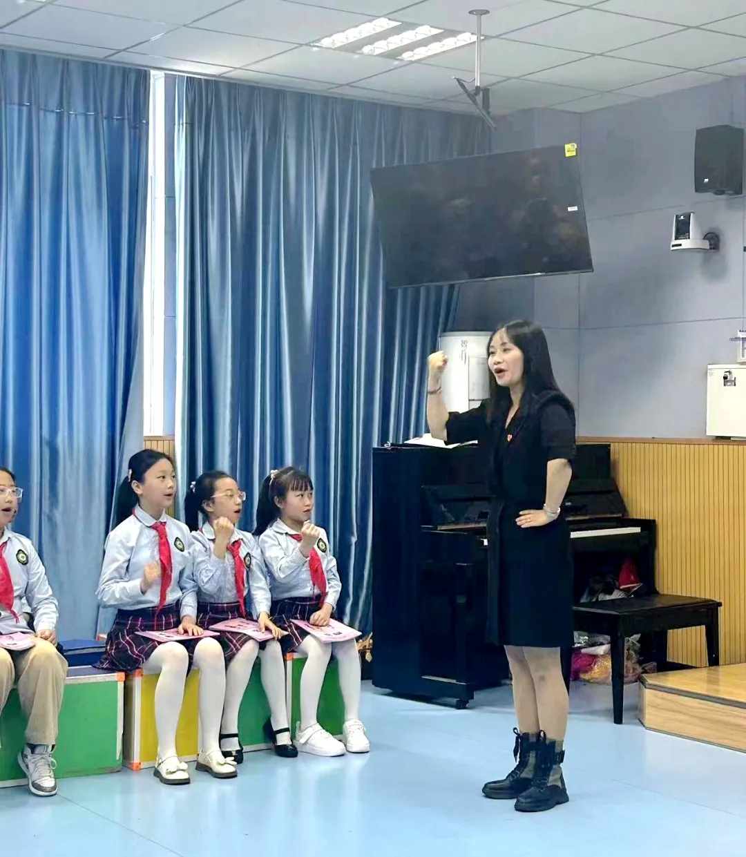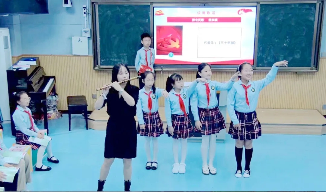 蔡娜老师执教四年级音乐课《陕北绿了,百姓笑了》。这节课将音乐与思政进行学科大融合,通过开展课前导学研学,结合思政元素,唱红歌学党史,开启陕北红色革命音乐文化之旅。课堂上同学们唱响绥德歌谣,敲起横山腰鼓,充分感受音乐的力量。
