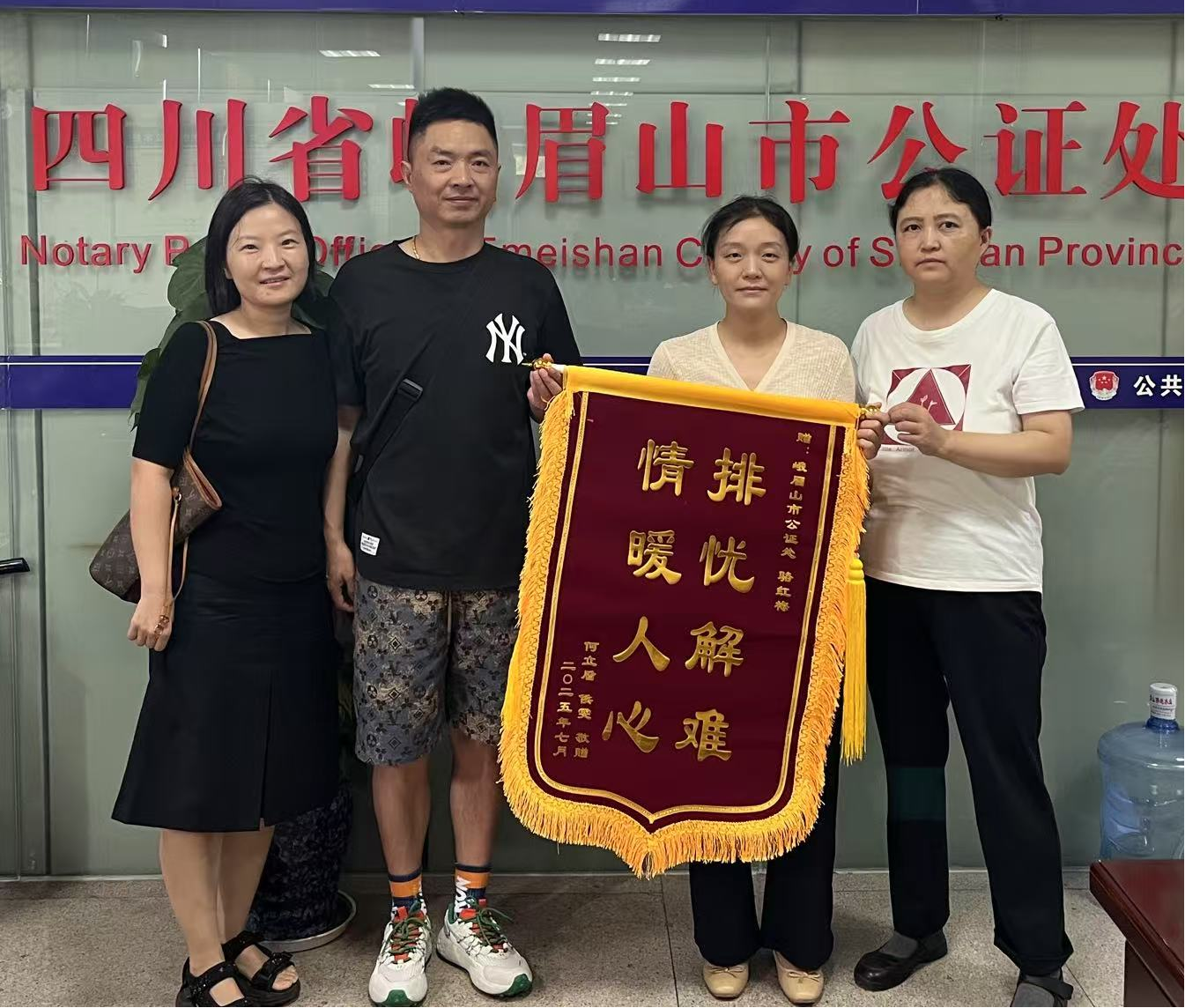 2025年7月14日,峨眉公证处发生了温暖一幕。当事人何先生和侯女士满怀感激,将一面写有“排忧解难,情暖人心”的锦旗送到公证人员石晔、骆红梅手中,以此表达对他们提供延时服务的深深谢意。