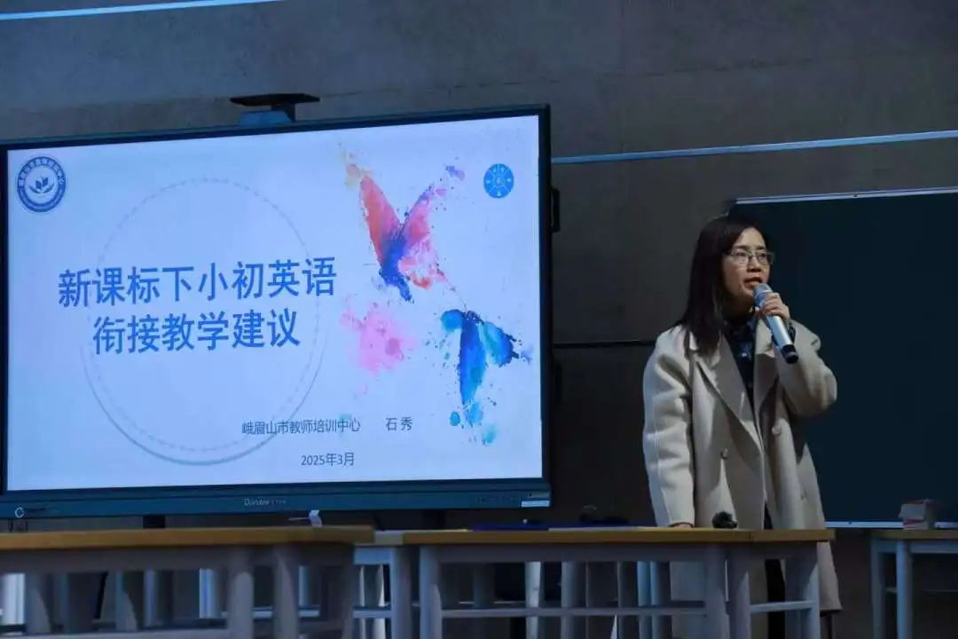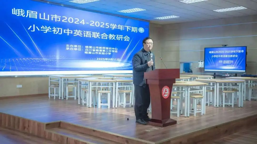 为落实新课标学业质量要求,推动中小学英语学科跨学段融通教学,提高课堂教学效益,促进全市英语学科教学质量的整体提升,2025年3月11日,峨眉山市六、七年级英语联合研训会在峨眉二中城东校区召开,全市六、七年级英语教师、峨眉山市教师培训中心主要领导、部门负责人、英语教研员共计近90人参加了此次会议。