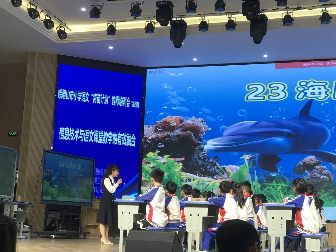 峨眉实小张晓静老师、峨眉二小蒋灵丽老师分别作了《海底世界》《巨人的花园》的课例展示。张老师紧扣单元目标,以大情境、大任务推进教学,利用多媒体技术巧妙融入学习情境,学生如临其境,学得轻松快乐,学得扎实有效。蒋老师充分利用现代媒体交互功能,将学习目标分解,条理清楚,层层推进,由浅入深,边读边想边交流,取得了很好的教学效果。