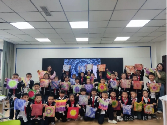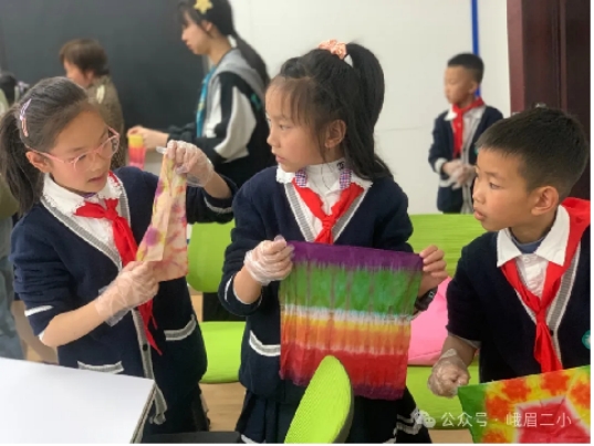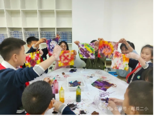随后,大家一同体验中国传统技艺扎染的艺术魅力。在老师们精心准备,认真仔细讲解下,孩子们迫不及待,跃跃欲试。在看似无序的捆扎之间,感受惊喜和温暖;在独特的图案之中,体会一份民间艺术的传承。单纯朴素的白布,变身出独一无二的色彩,每一张图案,都是孩子们沉浸在其中的智慧与喜悦。