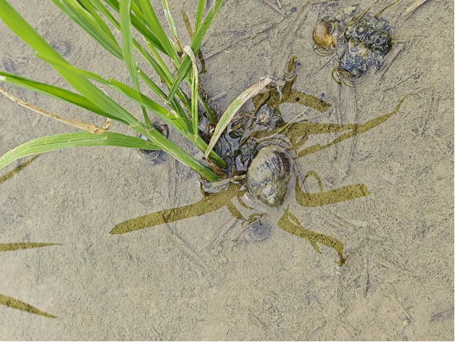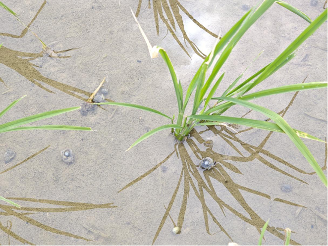 生态调控:利用水旱轮作自然灭螺,旱作期1个月以上可以有效杀灭田间残留福寿螺。在水稻生产前期,利用幼螺抗性差的特点,适当脱水露田几天,以消灭福寿螺幼螺。