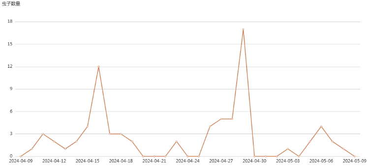 今年我市于4月9日在灯下首次发现二化螟成虫。截至5月9日,桂花桥镇2个智能虫情测报灯一共监测到97头二化螟,其中水稻基地监测到76头二化螟(如图2所示)。一代二化螟发蛾高峰期在4月18日至5月8日(4月29日),预计卵孵化盛期在5月中旬。由于二化螟越冬场所复杂,发育进度不一,导致一代发蛾期较长,5月下旬还将有一个为害小高峰。