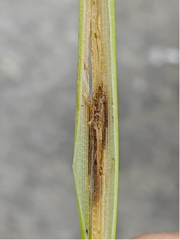 二化螟俗称钻心虫,是水稻上的一种重要害虫,在水稻不同的生长阶段均能发生。现阶段主要危害水稻叶鞘,造成枯鞘症状(图1);后期会导致水稻出现枯心苗、枯孕穗和白穗等症状,严重影响水稻的产量和质量。