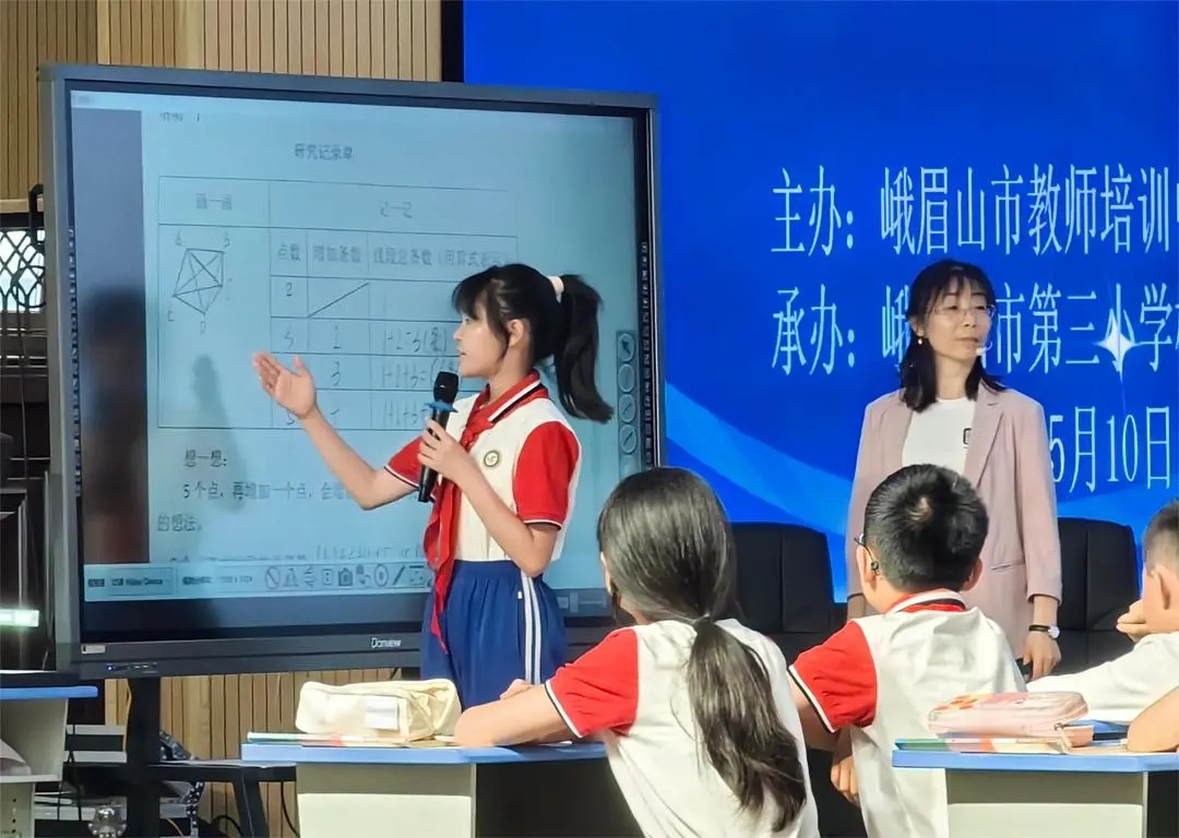 峨眉三小张磊老师、峨眉一小古登霞老师以“数学思考例1”为内容进行了同课异构课例展示。张老师从北斗导航系统发射58颗卫星的实际情境中提出数学问题,从简单的情形入手,基于学生的操作实践,抓住关键问题层层追问,沟通数、式、形,联结相关问题,建构一类问题的解决策略,形成结构化的认知。古老师直接从“20个点最多能连多少条线段”的数学问题引入,抓住学生探索中的生成点,聚焦重难点进行深入引导,注重对探究过程的回顾反思,提升问题解决的经验与方法。两位老师虽有着不同的教学设计与实施,但都注重激发学生“从简单想起”的探究需求,以“教学评一致性”的学习任务驱动学生经历操作实践、观察比较、猜想验证的过程,归纳规律、表达规律、运用规律,进一步提升运用数形结合、化难为易等思想方法解决问题的经验,提升了学生的推理意识、模型意识等核心素养。