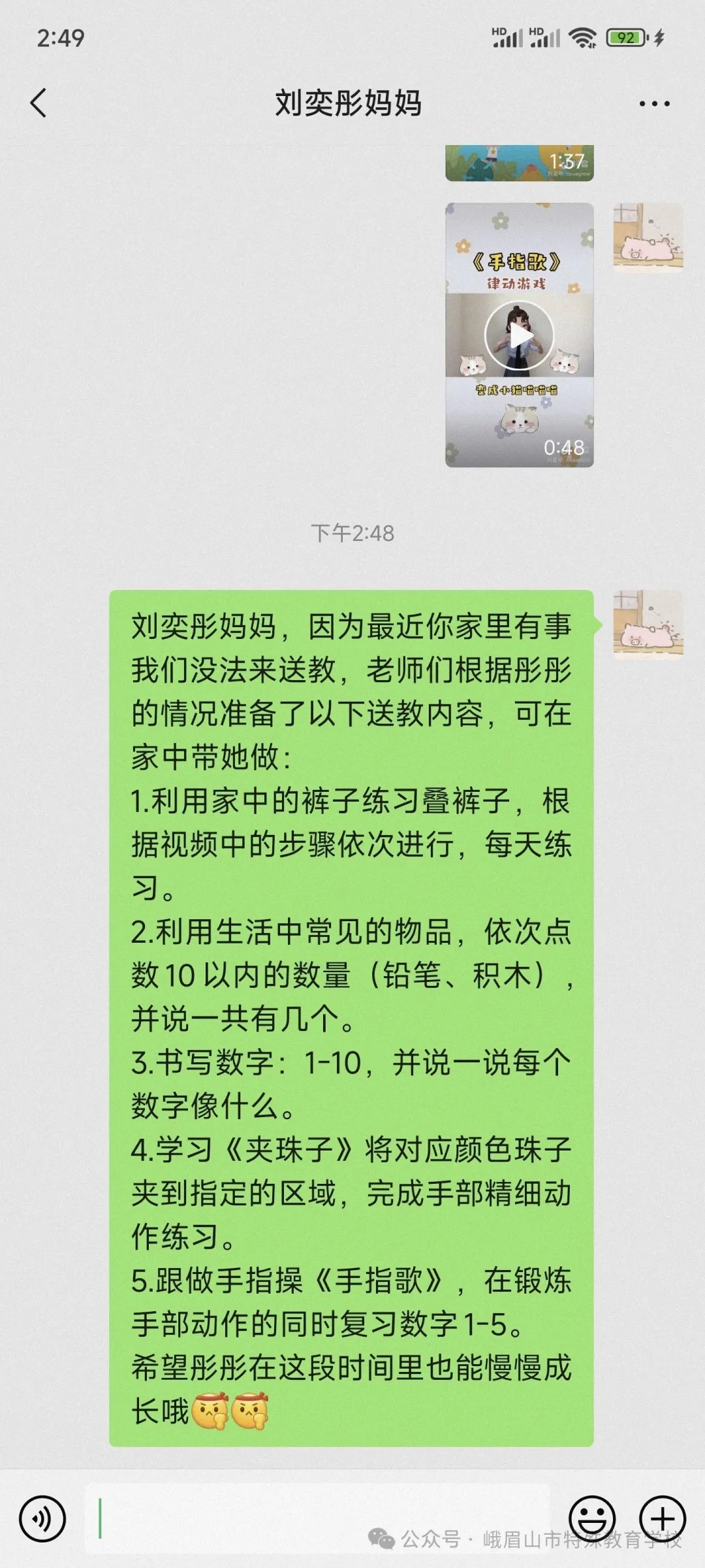 3月21日,由于彤彤家的特殊情况导致老师无法到家送教。老师们根据彤彤的评估情况为家长推送了相应的学习资料,例如“叠裤子、手指操、抓小鱼”等学习视频,帮助家长锻炼彤彤生活自理的基本技能,并巩固点数认数的能力,让彤彤在家也能收获成长。