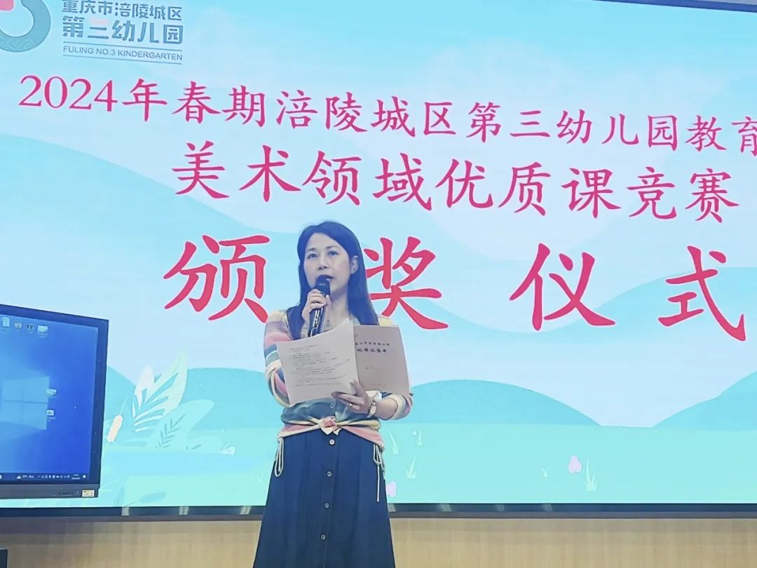 峨眉实幼副园长殷晓红代表实幼教学管理团队,聚焦美术核心经验,从活动目标设定、流程设计、活动组织、师幼互动及效果达成等方面对每一个参赛活动进行了专业评析,并为获奖教师颁发了奖项。