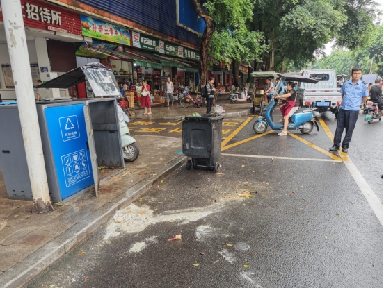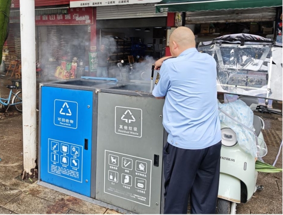 8月25日,市贸易中心正门附近传来爆炸声,一个垃圾桶内突然冒出浓烟,刺鼻气味迅速弥漫开来——正值胜利二中队执法队员黄小波、李超、邓浩羚在执行日常市容巡查任务,三人闻声立即冲向事发点。
