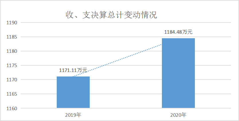 2020年度收、支总计1184.48万元。与2019年相比,收、支总计各增加13.37万元,增长1.14%。主要变动原因是在职人员增加(图1:收、支决算总计变动情况图)