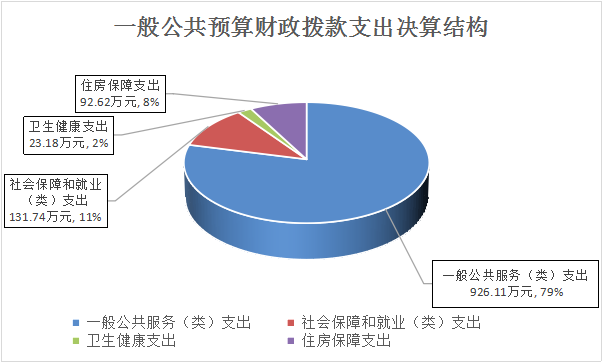 2020年一般公共预算财政拨款支出1173.65万元,主要用于以下方面:一般公共服务(类)支出926.11万元,占78.91%;社会保障和就业(类)支出131.74万元,占11.22%;卫生健康支出23.18万元,占1.98%;住房保障支出92.62万元,占7.89%。