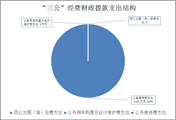 2020年“三公”经费财政拨款支出决算中,因公出国(境)费支出决算0万元,占0%;公务用车购置及运行维护费支出决算0万元,占0%;公务接待费支出决算0.45万元,占100%。具体情况如下: