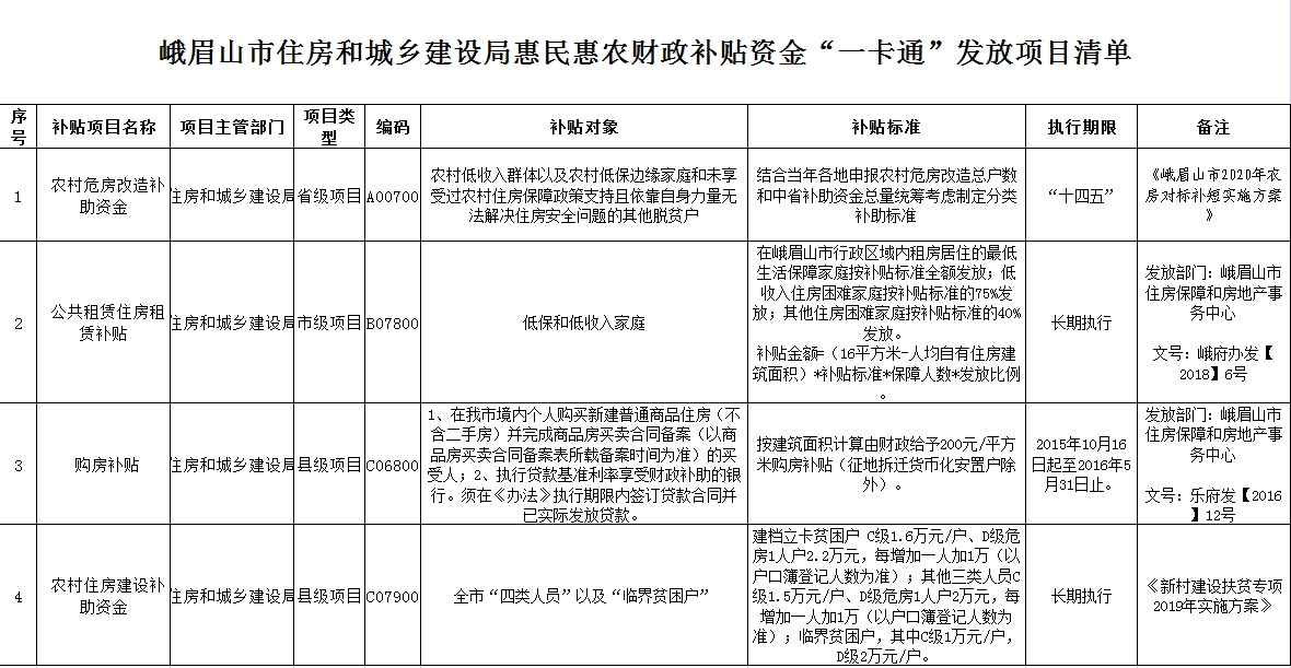 峨眉山市住房和城乡建设局惠民惠农财政补贴资金“一卡通”发放项目清单公开