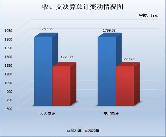 2022年度收、支总计1279.73万元。与2021年相比,收、支总计各减少509.35万元,下降28.47%。主要变动原因是项目经费减少,厉行节约。