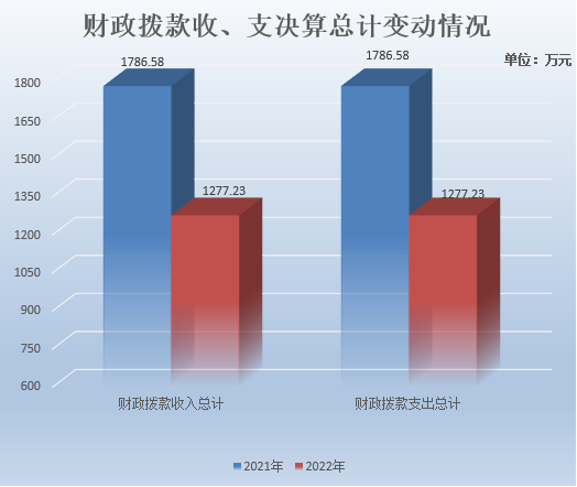 2022年财政拨款收、支总计1277.23万元。与2021年相比,财政拨款收、支总计各减少509.35万元,下降28.51%。主要变动原因是项目经费减少、厉行节约。