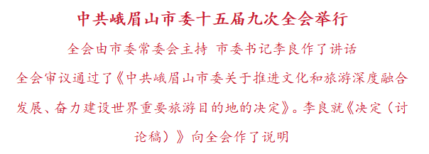 全会审议通过了《中共峨眉山市委关于推进文化和旅游深度融合发展、奋力建设世界重要旅游目的地的决定》。李良就《决定(讨论稿)》向全会作了说明。