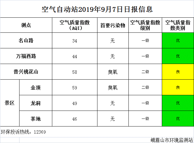 【峨眉山生态环境局】空气自动站2019年9月7日日报信息