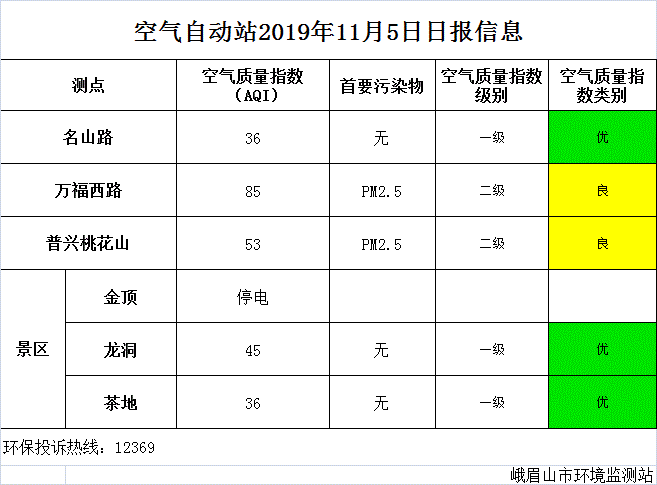 【峨眉山生态环境局】空气自动站2019年11月5日日报