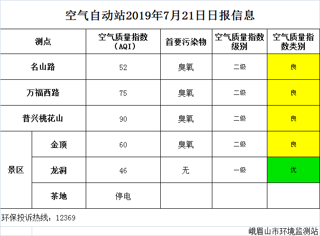 【峨眉山生态环境局】空气自动站2019年7月21日日报信息