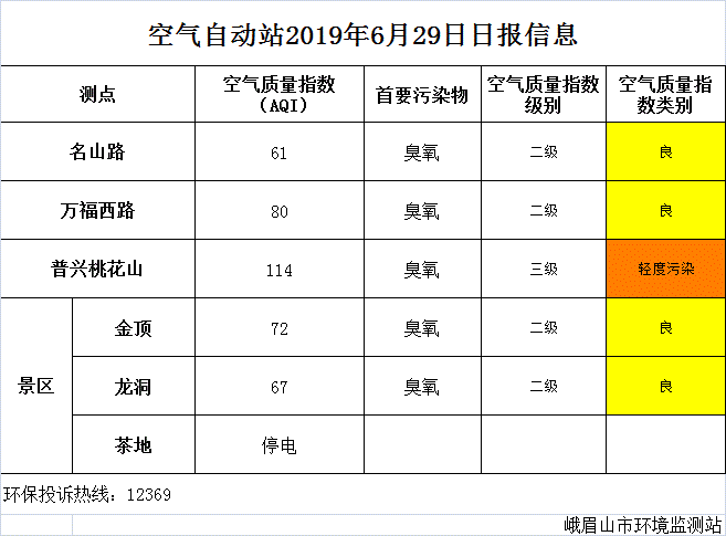 【峨眉山生态环境局】空气自动站2019年6月29日日报信息