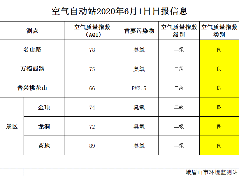 【峨眉山生态环境局】空气自动站2020年6月1日日报