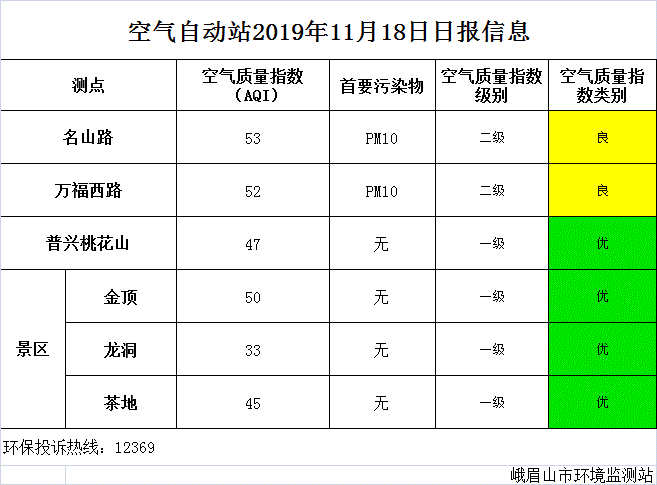 【峨眉山生态环境局】空气自动站2019年11月18日日报