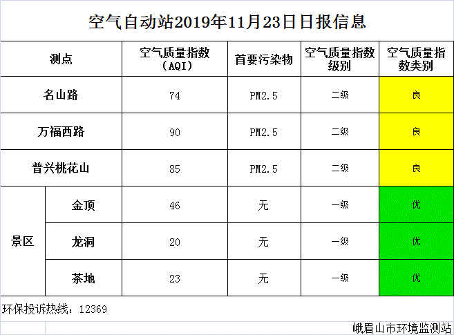 【峨眉山生态环境局】空气自动站2019年11月23日日报
