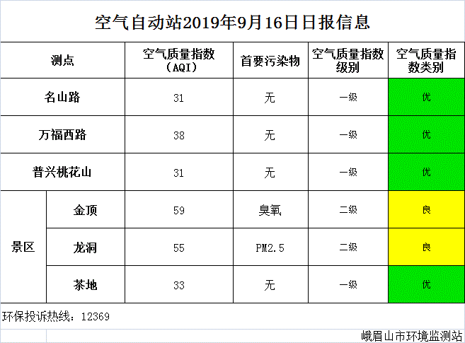 【峨眉山生态环境局】空气自动站2019年9月16日日报信息