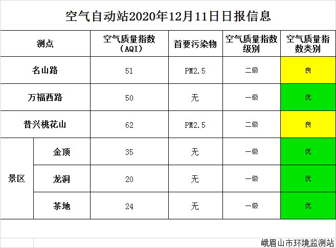 【峨眉山生态环境局】空气自动站2020年12月11日日报