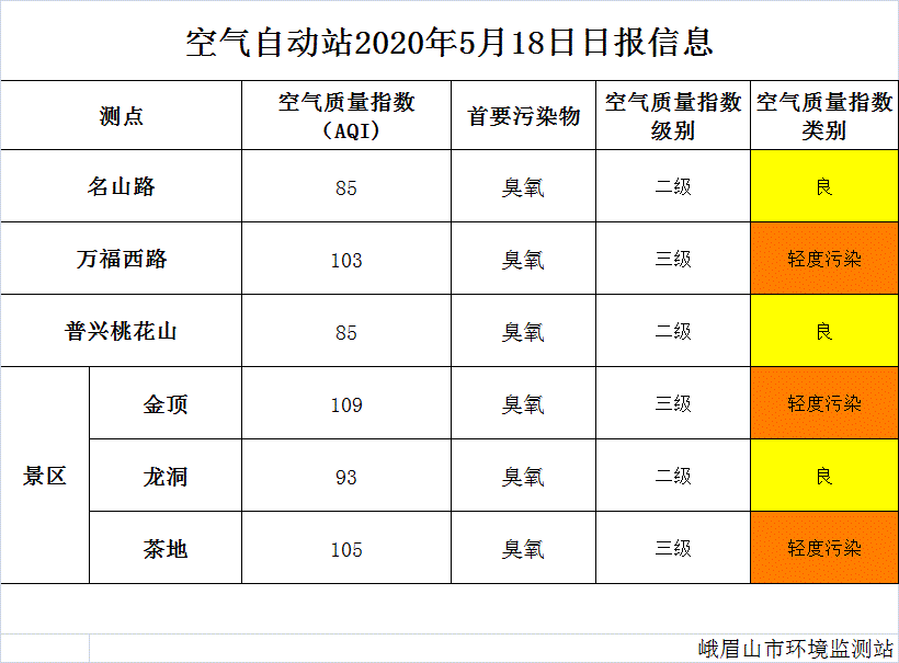 【峨眉山生态环境局】空气自动站2020年5月18日日报