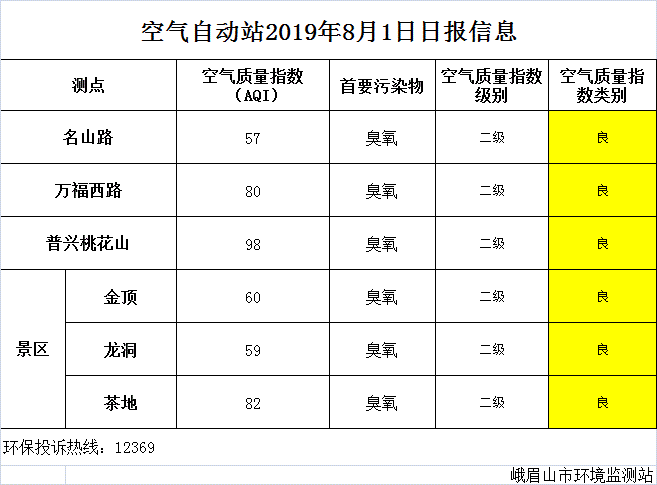 【峨眉山生态环境局】空气自动站2019年8月1日日报信息