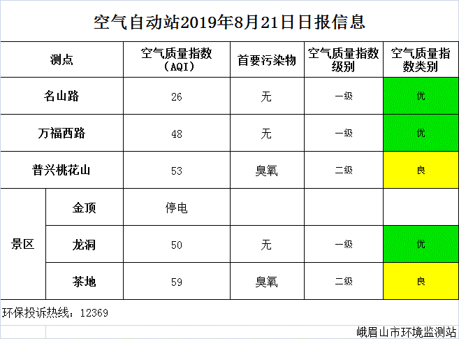 【峨眉山生态环境局】空气自动站2019年8月21日日报信息