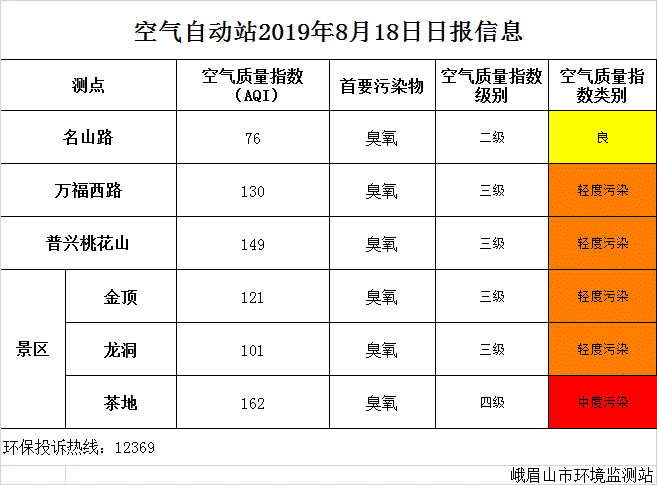 【峨眉山生态环境局】空气自动站2019年8月18日日报信息