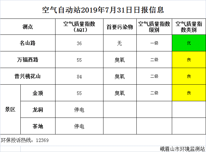 【峨眉山生态环境局】空气自动站2019年7月31日日报信息