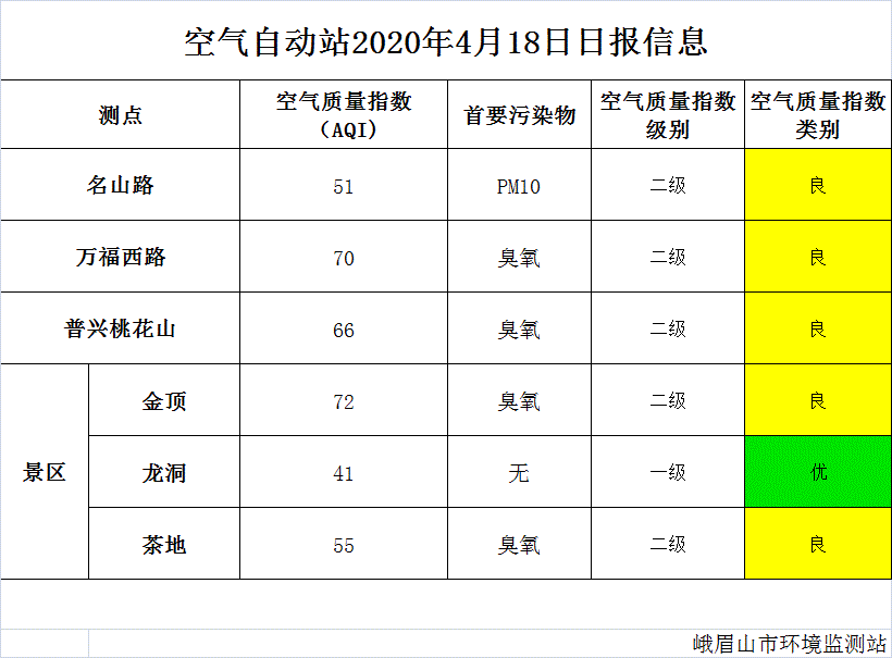 【峨眉山生态环境局】空气自动站2020年4月18日日报