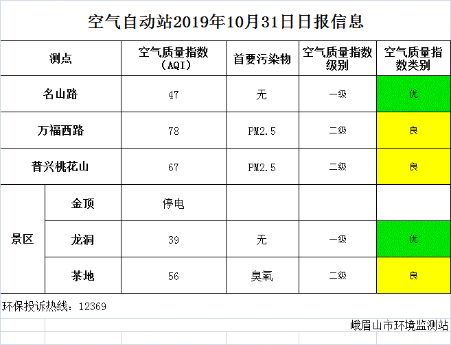 【峨眉山生态环境局】空气自动站2019年10月31日日报