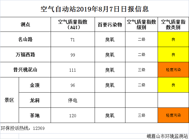 【峨眉山生态环境局】空气自动站2019年8月7日日报信息