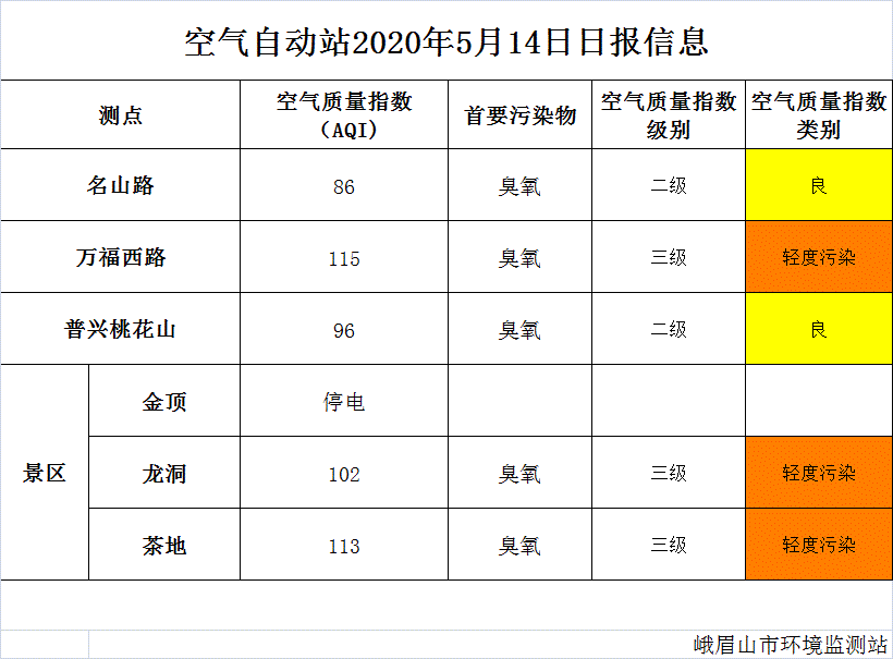 【峨眉山生态环境局】空气自动站2020年5月14日日报