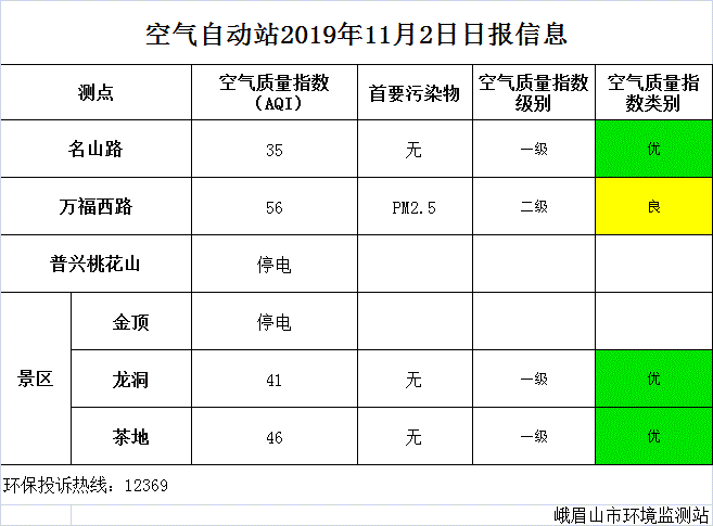 【峨眉山生态环境局】空气自动站2019年11月2日日报