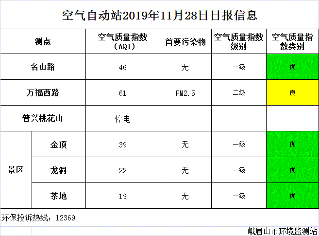 【峨眉山生态环境局】空气自动站2019年11月28日日报