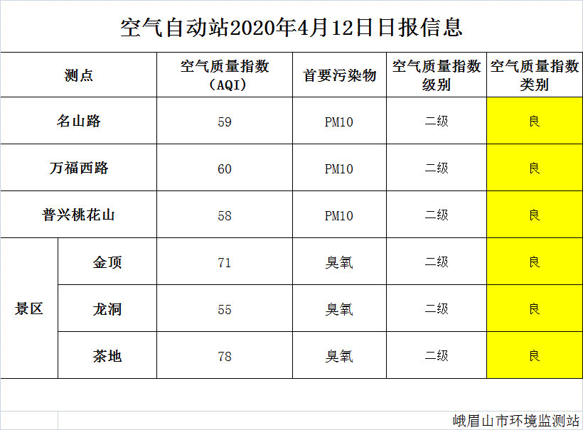 【峨眉山生态环境局】空气自动站2020年4月12日日报