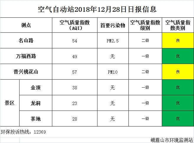 【市环保局】空气自动站2018年12月28日日报信息